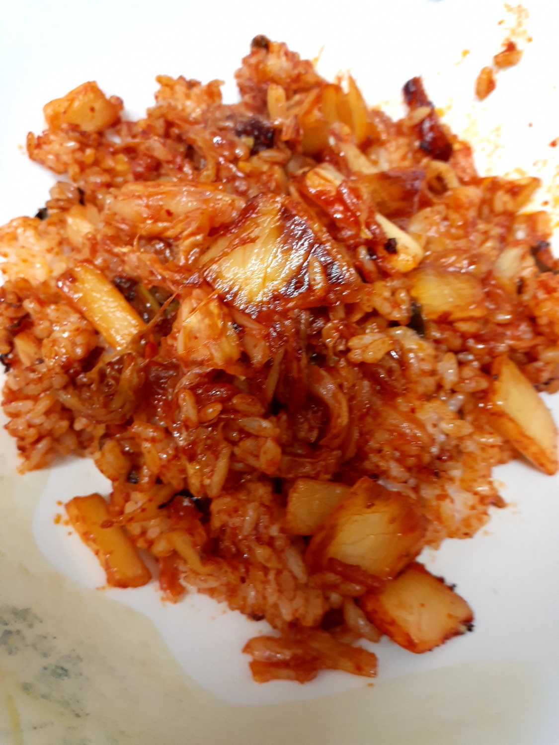 Una vez que todo esté bien combinado y el arroz esté ligeramente frito, apaga el fuego. Sírvelo caliente en un tazón. Para un extra de disfrute, cúbrelo con un huevo frito, un poco de alga nori desmenuzada (gim) o semillas de sésamo tostadas. ¡Esta comida sencilla pero satisfactoria, el delicioso arroz frito con kimchi, está lista para ser disfrutada!