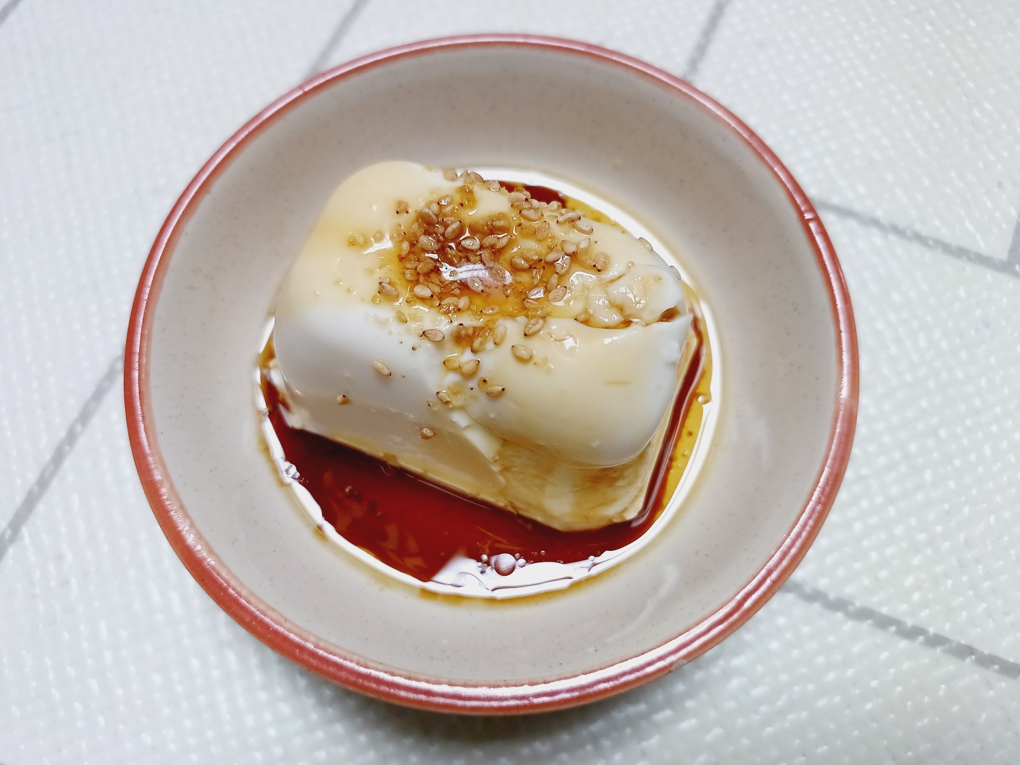 Finalmente, espolvorea una pizca de semillas de sésamo tostadas y trituradas sobre la salsa en el tofu sedoso. El crujiente a nuez de las semillas de sésamo realza el plato en general. ¡Este plato de tofu es increíblemente sencillo de preparar! Es casi increíble lo fácil que es, y sin embargo, los niños lo devoran con tanto deleite.
