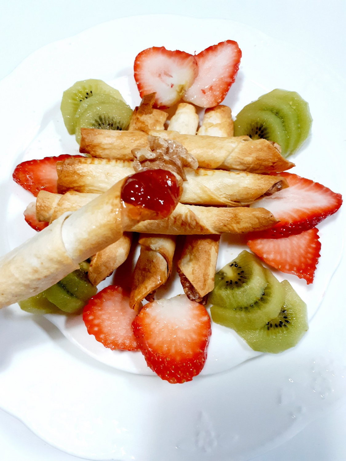 ¡Voilà! Tus rollitos crujientes y tiernos de tortilla con nueces están listos. Sírvelos calientes. Son deliciosos para mojar en miel, sirope o tu mermelada favorita. ¡Disfruta de este postre fácil y delicioso con tu familia y amigos!