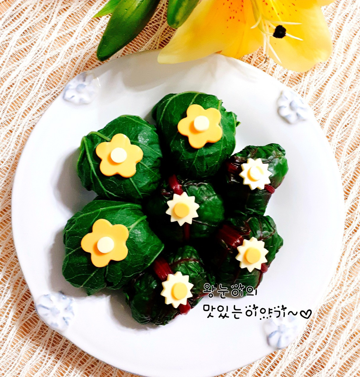 ¡Voilà! Sus aromáticos rollitos de arroz ‘ssam’ de hoja de Petasites y sus frescos rollitos de acelga roja están listos. Para hacer su lonchera especialmente atractiva y visual, he utilizado un cortador de galletas con forma de flor para cortar las rodajas de queso amarillo y blanco y colocarlas encima de los rollitos. Estos toques decorativos harán que su lonchera sea increíblemente encantadora para picnics o salidas. ¡Disfrute de sus saludables, hermosos y deliciosos rollitos de arroz ‘ssam’! ♡