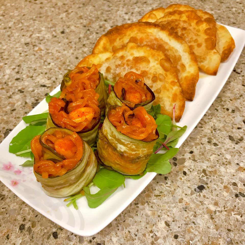 Rollitos de Berenjena con Fideos Salteados al Ajo y Empanadillas Fritas