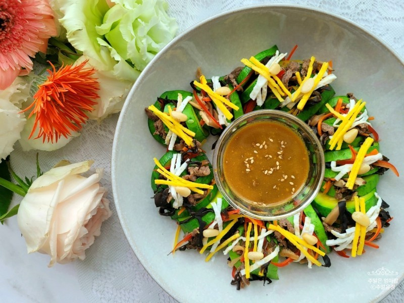 ¡Sé testigo de la elegante transformación del calabacín en un plato sofisticado! Aunque el Hobakseon requiere un poco de esfuerzo, la armoniosa mezcla de varios ingredientes crea un perfil de sabor delicioso, lo que lo hace perfecto para servir a invitados. Su naturaleza ligera y no grasosa también lo convierte en una excelente opción para una dieta saludable.^^