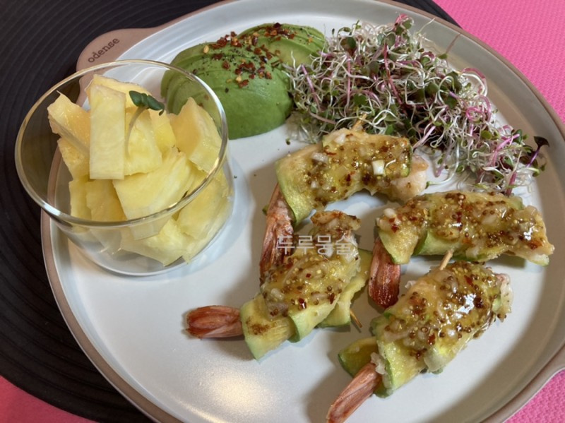 ¡Y aquí lo tiene! Coloque los rollos de gambas envueltos en calabacín, crujientes y apetitosos, en un plato para servir. Decore con brotes frescos, rodajas de aguacate cremoso y unos trozos de piña refrescante. Sírvalos con la deliciosa salsa que preparó, ¡y disfrute de este impresionante plato que hará que su ocasión especial sea aún más memorable y placentera!
