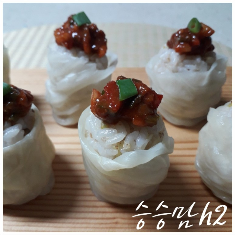 ¡Finalmente, decora con cebolleta finamente picada para darle un toque de color y frescura. Tus rollitos de col Yangbaechu bellamente elaborados están listos para disfrutar!