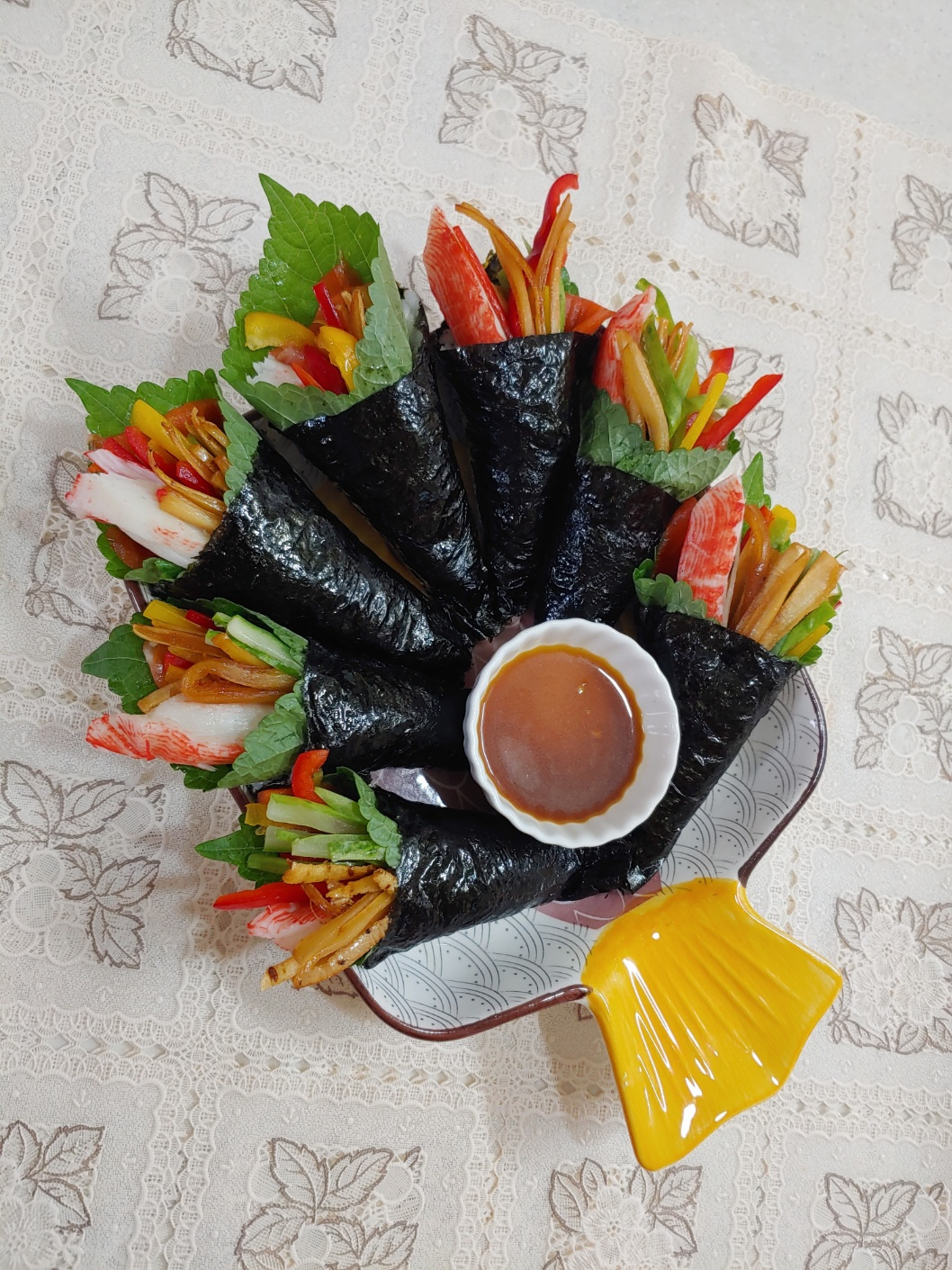 ¡Sus rollitos de gimbap de salmón ahumado están listos! Córtelos en trozos del tamaño de un bocado y colóquelos en un plato para servir. Prepare la salsa de mostaza mezclando 1 cucharadita de polvo de mostaza, 1 cucharada de salsa de soja, 1 cucharada de vinagre y ½ cucharada de azúcar hasta que esté suave. Ajuste las proporciones a su gusto.