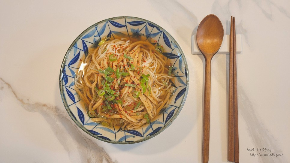 Escurra los fideos somen cocidos y enjuáguelos rápidamente bajo agua fría corriente. Este paso hace que los fideos estén más masticables y firmes. Justo antes de servir, sumerja los fideos en el caldo de udon hirviendo durante unos 5-10 segundos. Esta técnica de ‘enjuague en caldo’, llamada ‘to-ryeom’ en coreano, ayuda a evitar que los fideos se ablanden y les permite absorber un sabor sutil del caldo.