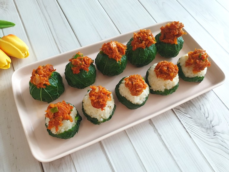 Finalmente, corona generosamente cada rollito de perilla envuelto con el salteado de atún a la Gochujang preparado. ¡Tus sencillos pero increíblemente sabrosos rollitos de perilla con atún están completos! Disfrútalos mientras estén tibios.