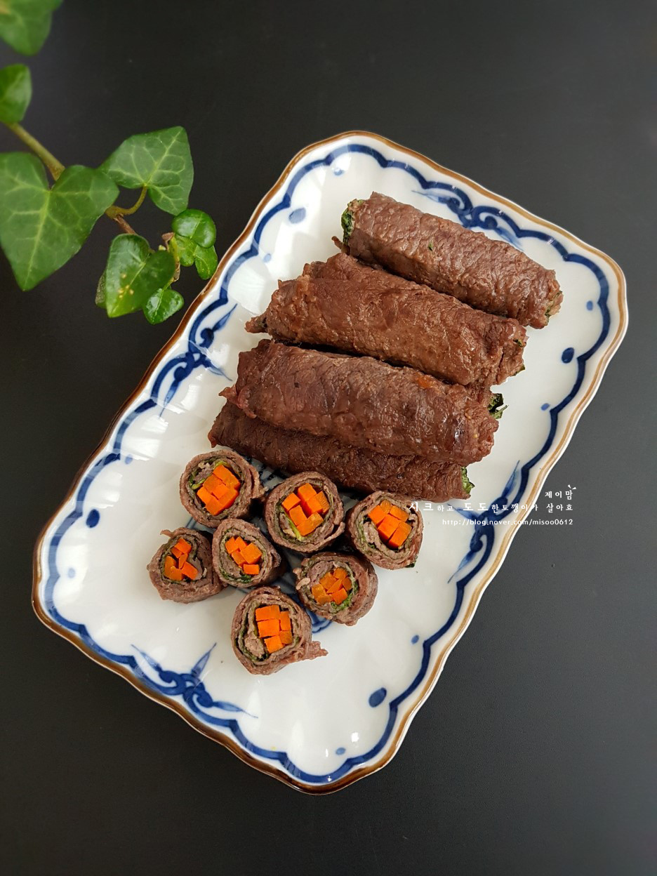 Lave bien las hojas de perilla bajo el chorro de agua. Después de lavarlas, escúrralas muy bien sacudiéndolas suavemente o secándolas con una toalla de cocina limpia. El exceso de agua puede hacer que los rollitos queden blandos. Pele las zanahorias y córtelas en juliana (tiras finas y largas). La cantidad de hojas de perilla y zanahorias no está estrictamente definida; ajústelas según la cantidad de ternera que esté utilizando. No dude en añadir otras verduras como pepino o pimiento para darle más sabor y textura.