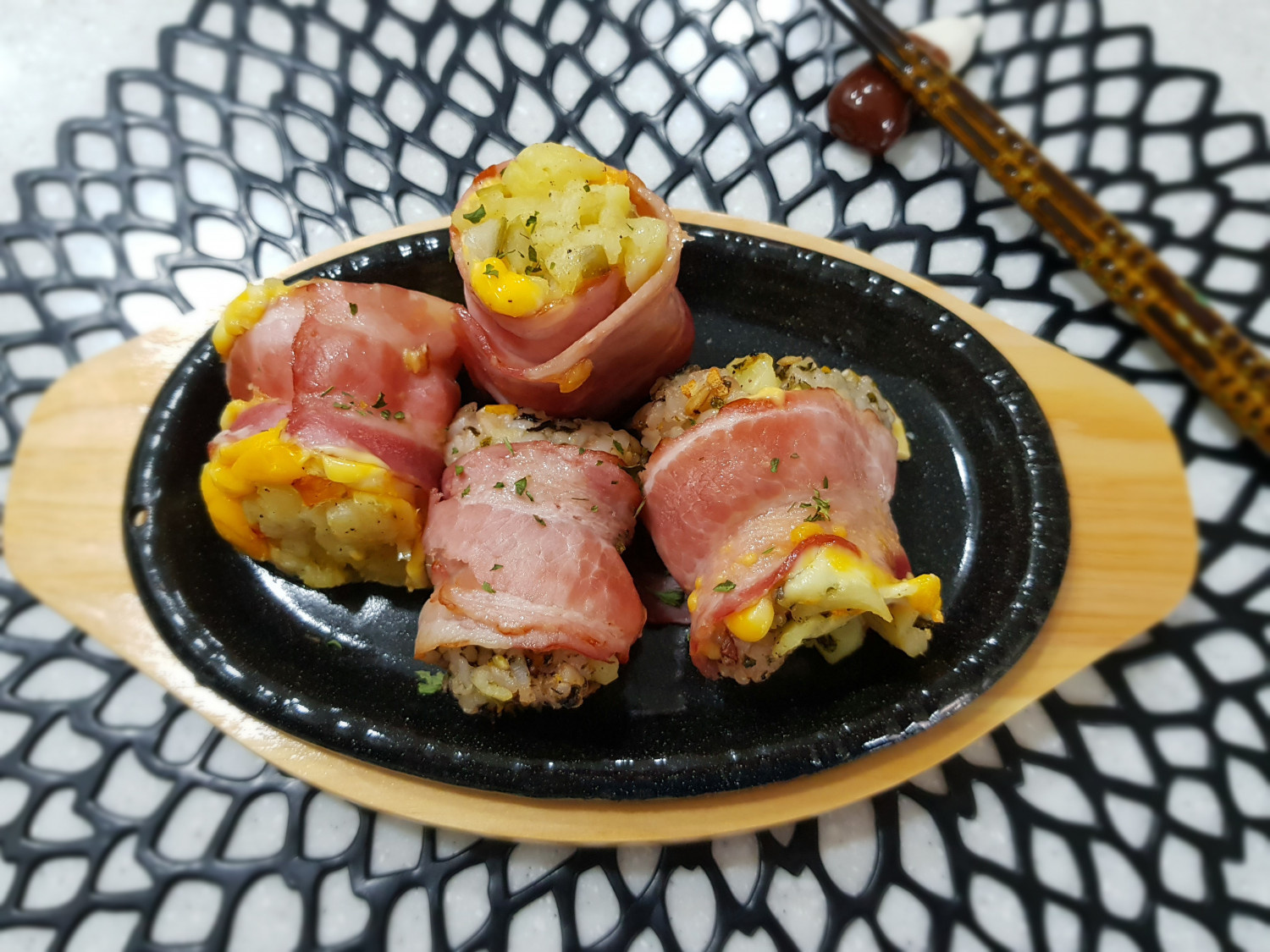 Crea los rollitos a base de arroz utilizando el mismo método. Coloca una loncha de queso procesado sobre el tocino, luego extiende la mezcla de arroz y algas sazonada con patatas trituradas finamente sobre ella.