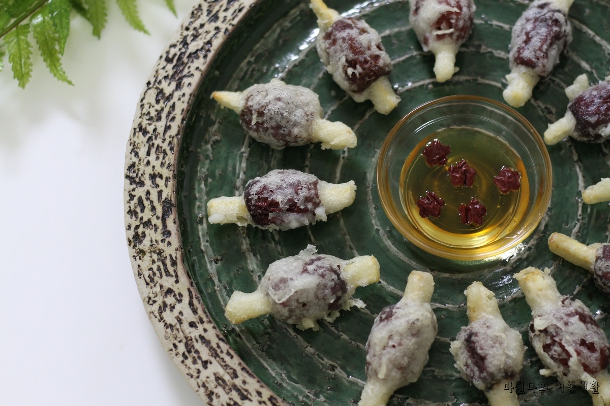 Hemos transformado el ginseng, un ingrediente precioso y bueno para la salud, en un delicioso snack friéndolo con dátiles secos dulces, creando una golosina especial que incluso los niños pueden disfrutar sin problema. Los dátiles secos se vuelven más dulces cuanto más tiempo se secan, y al freírlos, su dulzor se intensifica aún más. La combinación del dulzor del dátil y el sutil amargor del ginseng es absolutamente deliciosa. Te encantará la cobertura crujiente que da paso al dulce dátil y al aromático ginseng en su interior. Es un bocado perfecto para ocasiones especiales, un snack nutritivo para niños o un capricho saludable para ti. ¡Disfruta de esta explosión de sabor y salud!