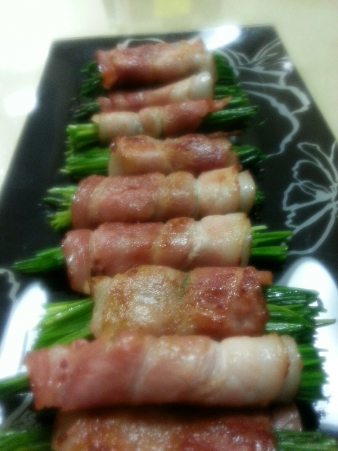 Lava bien el cebollino saludable. Córtalo en trozos que coincidan con el tamaño del tocino cortado por la mitad. Coloca un pequeño manojo de cebollino en un extremo de una loncha de tocino y luego enrolla el tocino firmemente alrededor del cebollino. Este proceso creará adorables rollitos mini de tocino del tamaño de un bocado.