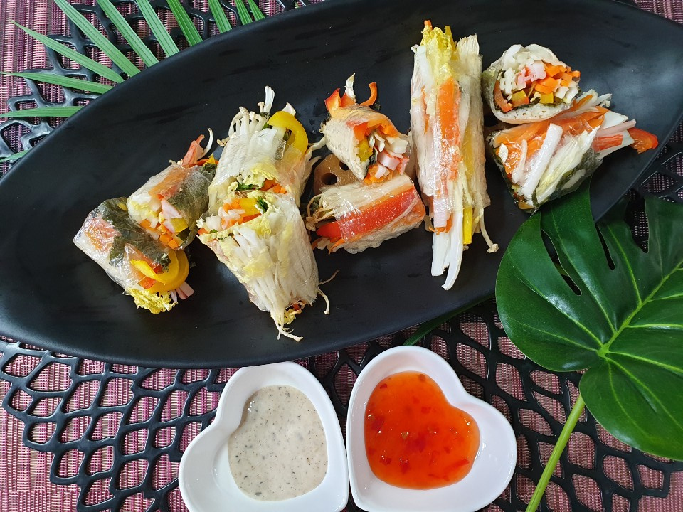 ¡Deliciosa dieta! Una fantástica combinación de vegetales frescos y raíz de loto masticable, presentamos un método para disfrutar aún más los rollitos vietnamitas. Enrolla varios vegetales en papel de arroz y disfruta un bocado con la crujiente raíz de loto. ¡Es la mejor opción para cuidar la salud y el sabor!