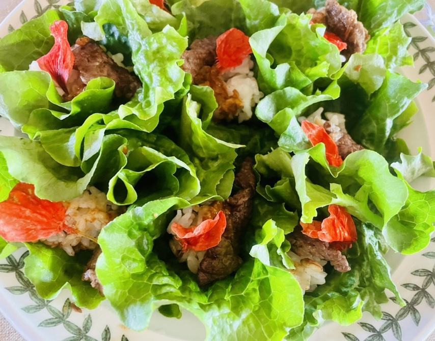 Les presento la receta para preparar un delicioso ‘rollo de lechuga flor’ (ssam bap) utilizando un manojo de lechuga fresca. ¡Su apariencia es como si una flor estuviera floreciendo! Al rellenarlo con arroz y sabrosos ingredientes, se convierte en un plato único visualmente encantador. Si cocinan finas láminas de carne de res (idealmente, corte para sopa) hasta que estén ligeramente doradas, sentirán un sabor más intenso y agradable con cada bocado. La preparación es sumamente sencilla: solo necesitan arroz, un poco de carne asada y pasta ssamjang. Es muy práctico de comer y se ha convertido en el plato único que siempre deseé. Al ser un plato único, no necesito preparar muchos acompañamientos, lo que da una sensación ligera y satisfactoria, además de facilitar la limpieza. La lechuga en sí parece capullos de flores abiertas, con el arroz y los ingredientes en su interior como el núcleo de la flor. Decorarlo con pétalos de capuchina comestible añade un toque vibrante de color, haciéndolo realmente hermoso. Las capuchinas tienen un color precioso y un ligero sabor ácido. Adornado con flores comestibles, este ‘verdadero rollo de lechuga flor’ es un deleite tanto para la vista como para el paladar.