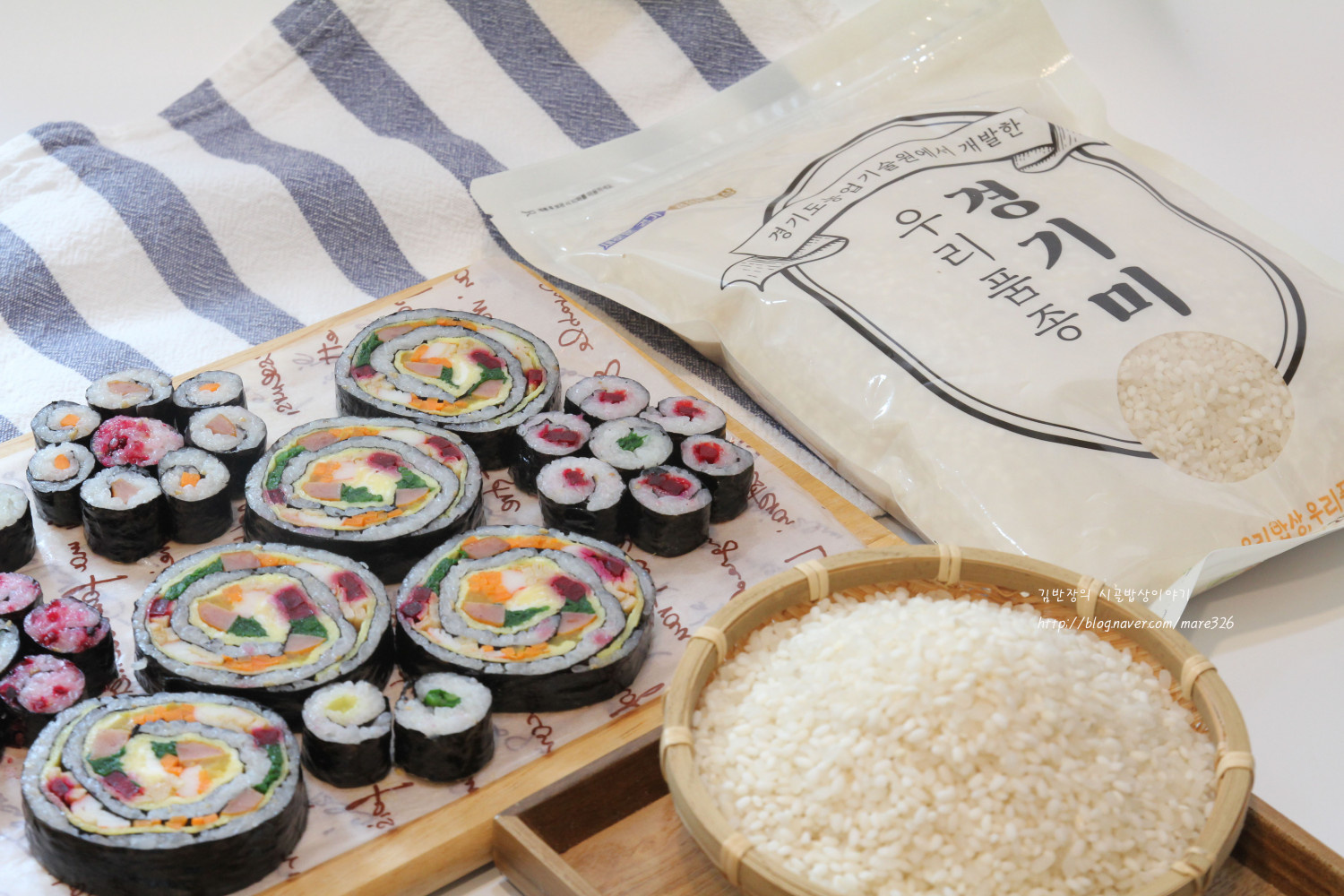 Hoy preparé unos rollos de sushi en espiral con el arroz Gyeonggimi Gawaji No. 1. El Gawaji No. 1 es un arroz de textura intermedia y pegajosa, ideal para sushi o cajas bento. Hice estos rollos sin añadir arroz glutinoso, y quedaron maravillosamente masticables y deliciosos. Quizás sea la calidad del arroz Gyeonggimi, pero su aroma sabroso realmente estimula el apetito.