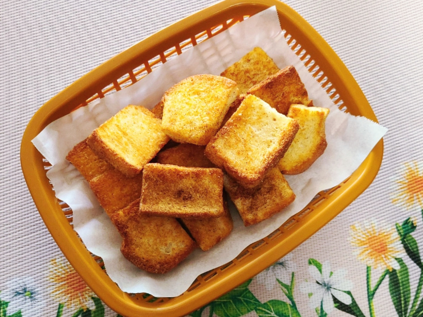 Coloca las rebanadas de pan azucaradas en la cesta de tu freidora de aire, asegurándote de que no se superpongan. Si se superponen, pueden no quedar crujientes uniformemente.