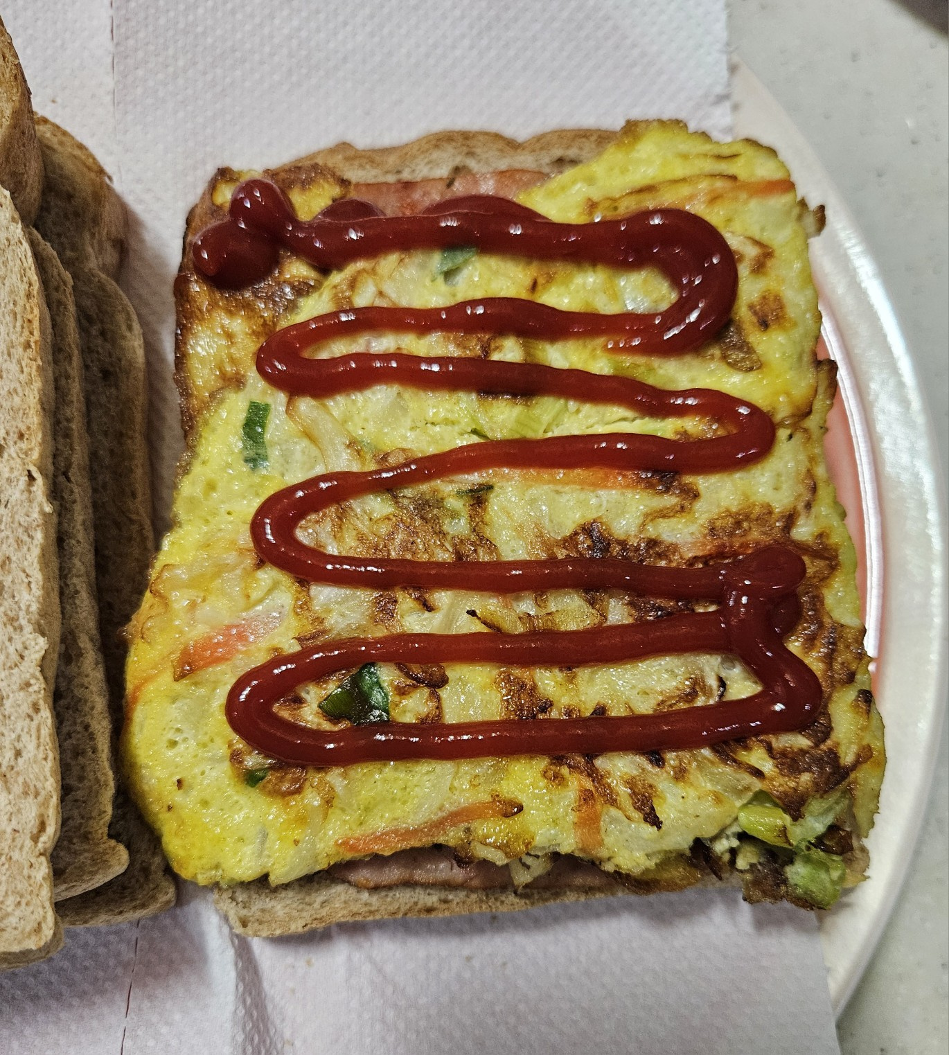Finalmente, rocía kétchup en zigzag sobre la tostada. También puedes añadir una pizca de azúcar para darle dulzor, si lo deseas. ¡Siéntete libre de añadir otros ingredientes según tu preferencia!