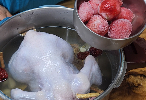 Aquí tienes un ingrediente secreto para eliminar cualquier olor fuerte del pollo en tu Samgyetang: ¡las fresas! Las fresas frescas son ideales, pero las congeladas también funcionan igual de bien, especialmente si las frescas están fuera de temporada. Personalmente, usamos fresas frescas que congelamos de nuestra cosecha de primavera. Las fresas también son geniales para hervir cerdo. No necesitas salsa de soja, doenjang ni café; solo fresas solas eliminarán eficazmente los olores desagradables. Son realmente excelentes para neutralizar cualquier sabor ‘de caza’ en las carnes.