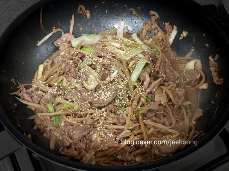 ¡Potenciador de Sabor! Finalización: Después de apagar el fuego, rocíe un poco de aceite de sésamo usando el calor residual de la sartén y espolvoree con semillas de sésamo tostadas para un aroma a nuez adicional. ¡Su delicioso salteado de ternera con bardana está ahora completo! ¡Disfrútelo con un tazón de arroz caliente!