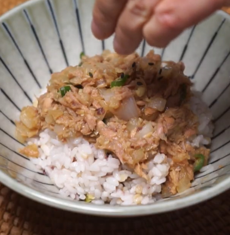 Sirve una cantidad generosa de la salsa de atún y soja terminada sobre un bol de arroz caliente. Simplemente mezclándolo, obtendrás un delicioso plato de arroz.