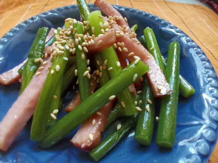 ¡Es la temporada de los tiernos y fragantes ajetes tiernos locales! Aunque la mayoría son importados, ver ajetes nacionales frescos me inspiró a crear este delicioso salteado con jamón. Es un acompañamiento fantástico que encantará a todos, jóvenes y mayores.