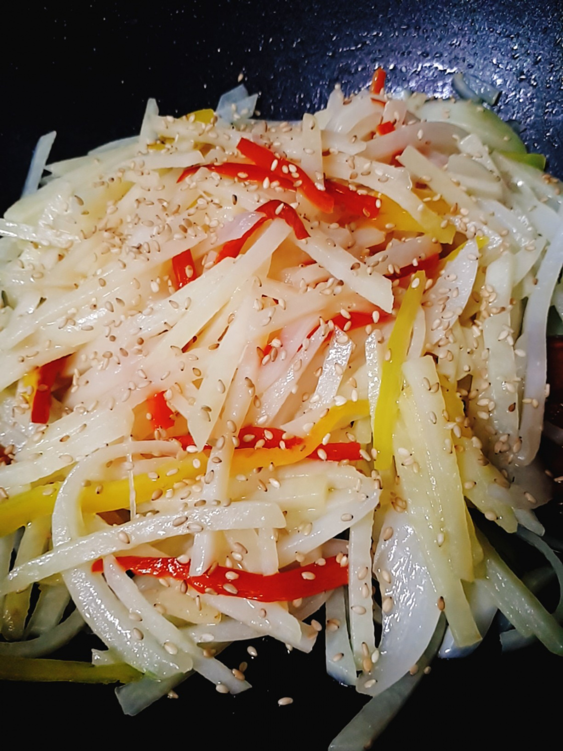 Finalmente, rocía con aceite de sésamo y mezcla bien. Espolvorea con 1 cucharada de semillas de sésamo tostadas. Apaga el fuego, tapa la sartén durante unos 30-40 segundos para que el calor residual termine de cocinar las patatas, asegurando que estén tiernas sin deshacerse. Este paso de reposo ayuda a que las patatas ligeramente menos cocidas se cocinen perfectamente y realza el sabor general. Remueve suavemente todo junto después de abrir la tapa para completar tu delicioso salteado de pimientos y patatas.