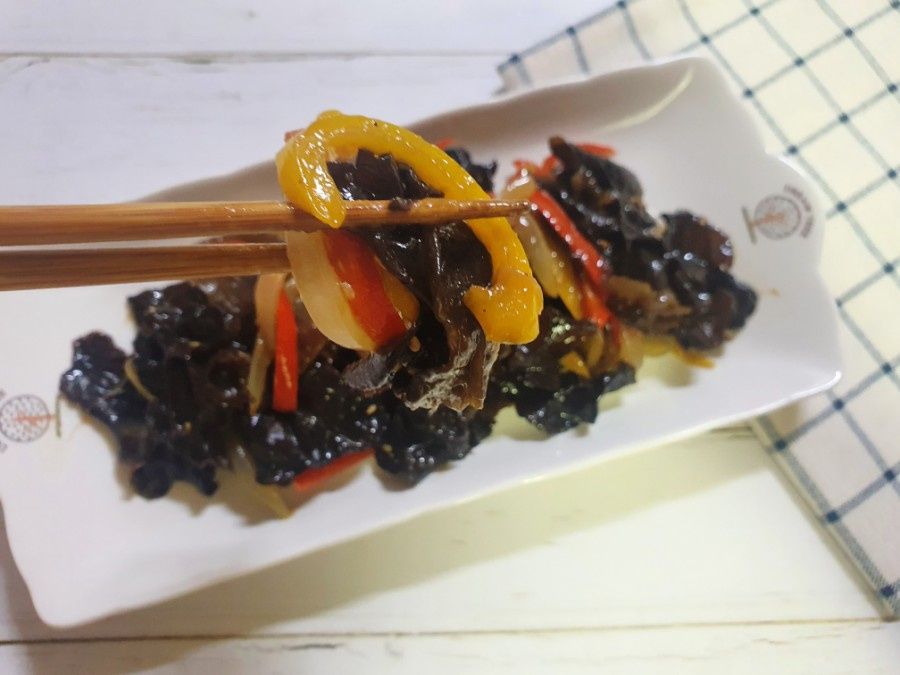 Agrega 0.5 cucharada de azúcar para equilibrar los sabores salados. Continúa salteando durante otros 2-3 minutos, asegurándote de que todos los ingredientes estén bien combinados y cubiertos con la salsa, hasta que las orejas de madera estén cocidas y tengan una textura ligeramente masticable.