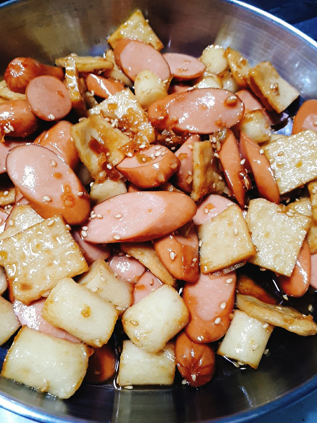 Descubrí un nuevo y fascinante set de pastel de pescado de arroz en un gran supermercado, así que lo compré y decidí preparar un guiso rápido con unas salchichas que tenía en casa. Dicen que lleva arroz, ¡y ciertamente es notablemente masticable y delicioso! Este plato es un acompañamiento maravilloso para el arroz o un bocadillo sabroso para los niños.