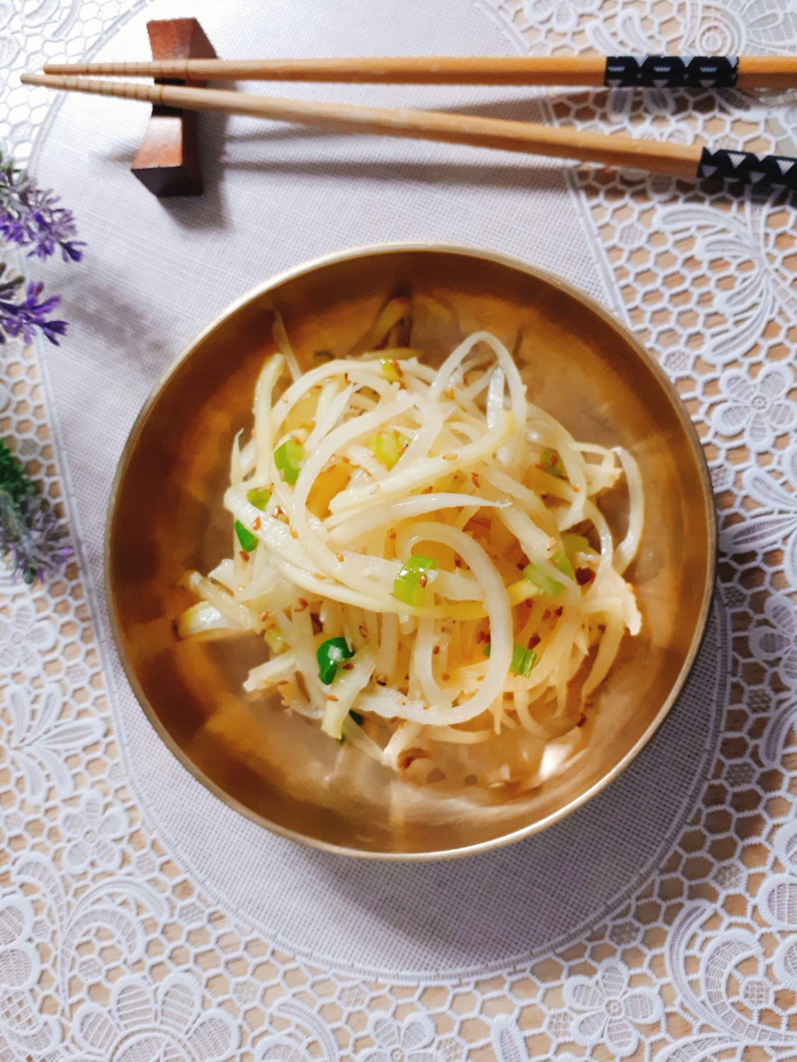 Esta es una receta para preparar raíz de campana (doraji) salteada, un ingrediente muy saludable y beneficioso, especialmente durante la temporada de resfriados. Este método asegura que la raíz se cocine sin amargor ni astringencia.