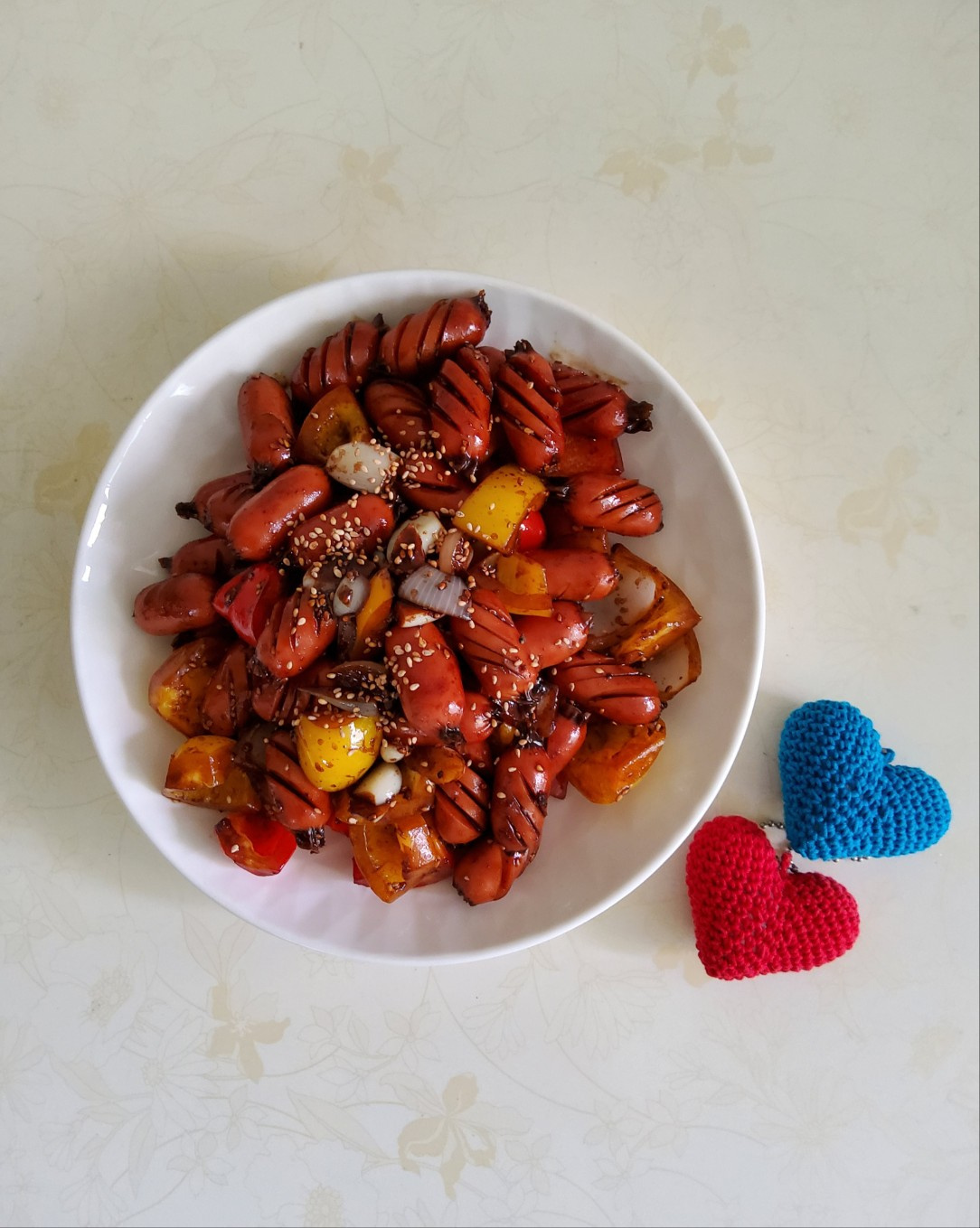 Receta de Salteado de Salchichas y Vegetales con Salsa Jjajang