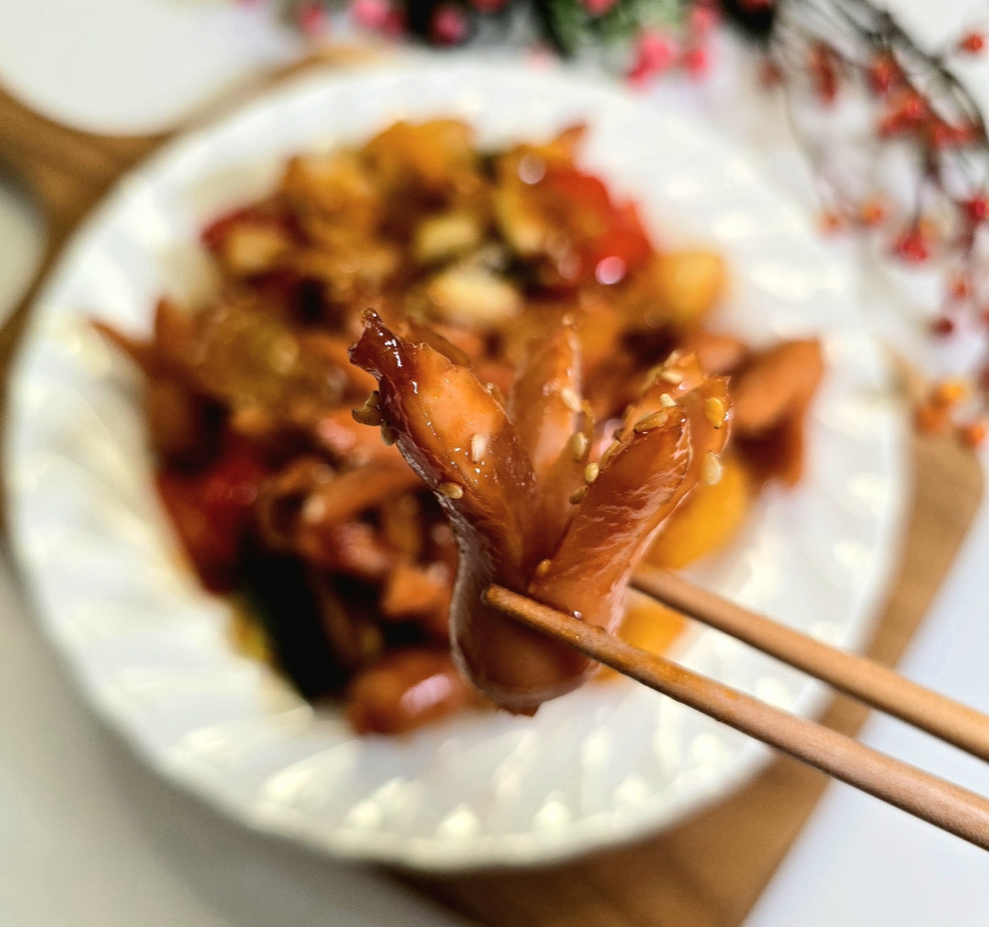 Cuando la salsa se haya reducido y todos los ingredientes estén bien cocidos, apague el fuego. Espolvoree con semillas de sésamo para un toque extra de sabor a nuez. ¡Su delicioso Salteado de Salchichas y Verduras (Ssoyabokkeum) está ahora completo! Es una guarnición perfecta para niños y un excelente aperitivo para disfrutar con bebidas.
