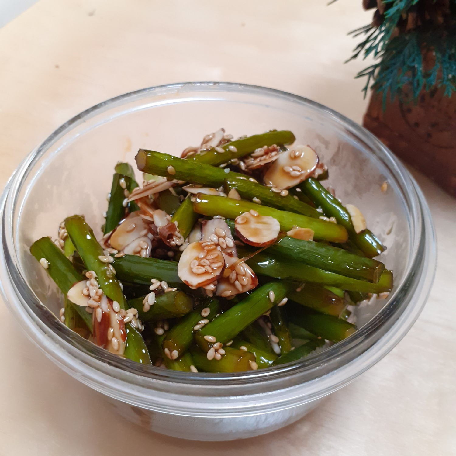 ¡Sus salteados de tallos de ajo, salados y tostados, están listos! La adición de almendras aporta una maravillosa profundidad de sabor. Si lo sirve a niños, ajuste el dulzor y las cantidades de salsa de soja a su gusto, y omita cualquier elemento picante. ¡Disfrute de su delicioso plato casero!