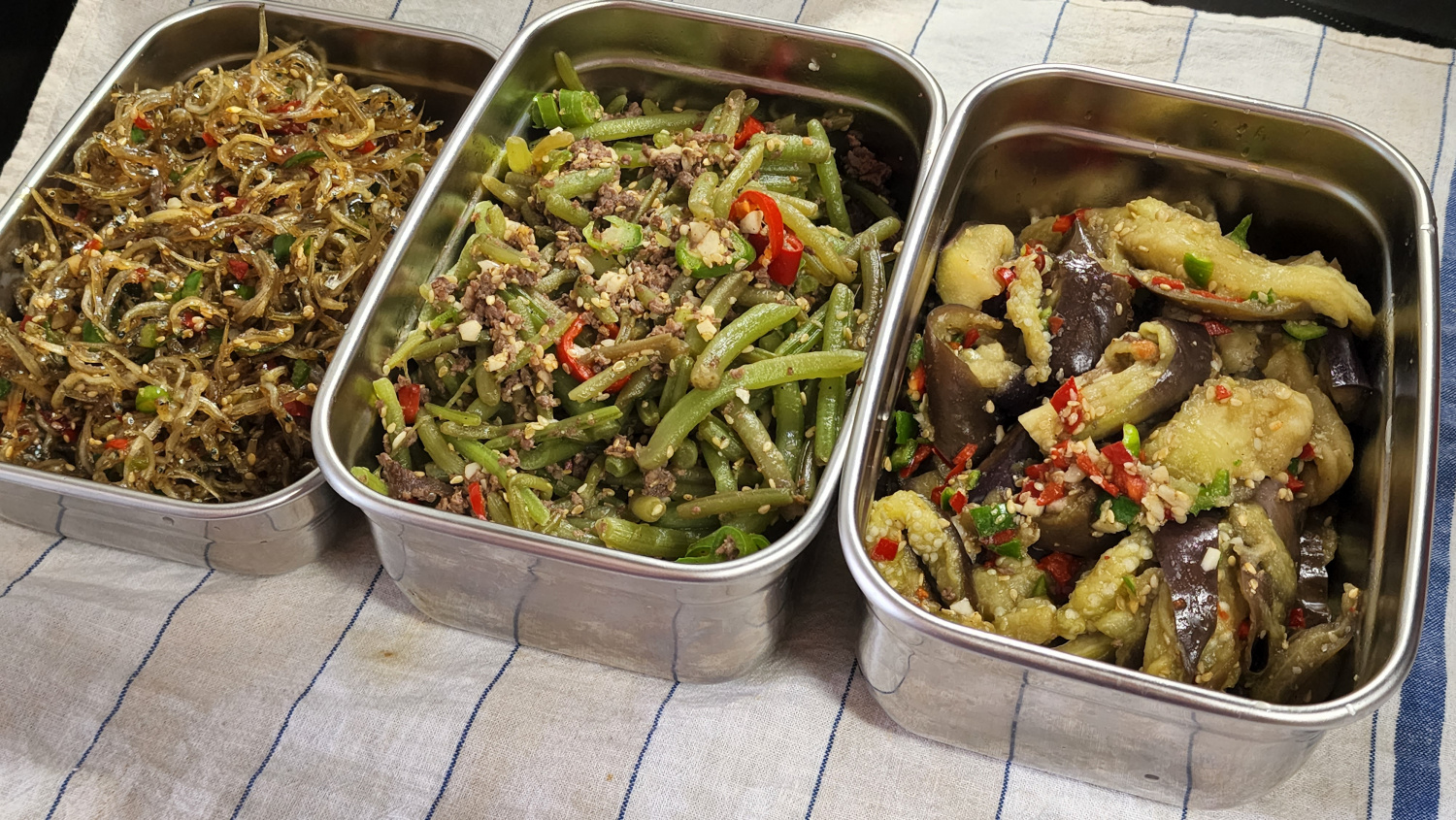 Salteado de Tallos de Batata con Ternera y Ensalada de Berenjena al Vapor con Chile y Salteado de Anchoas (3 Recetas de Banchan)