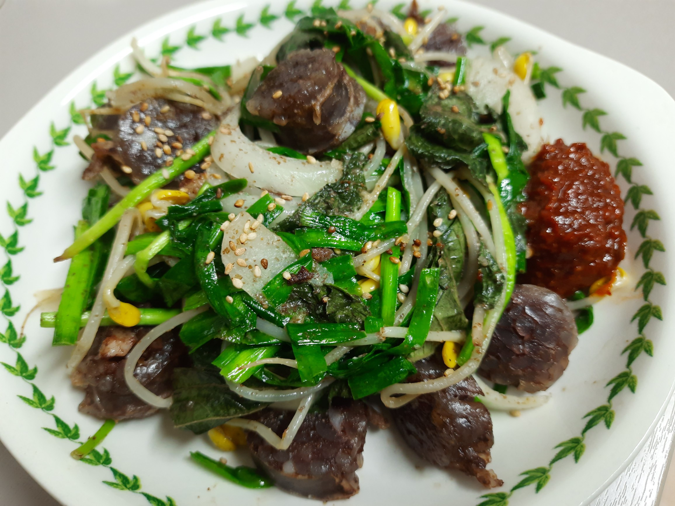 Mientras la salchicha se cocina al vapor, ¡hagamos una deliciosa salsa para mojar! En un tazón, combina 0.5 cucharada de gochujang, 0.5 cucharada de doenjang, 0.5 cucharada de polvo de perilla, 0.5 cucharada de vinagre, 0.5 cucharada de ajo picado, 1 cucharada de extracto de ciruela, 1 cucharadita de azúcar y 0.5 cucharada de aceite de perilla. Revuelve todo hasta que esté bien combinado para crear tu salsa sabrosa.
