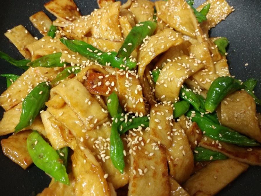 Una vez que los chiles se hayan ablandado, agrega el pastel de pescado cortado a la sartén y continúa salteando juntos. Saltear el pastel de pescado hasta que esté ligeramente dorado mejorará su textura y sabor. Sigue revolviendo para evitar que se quemen.
