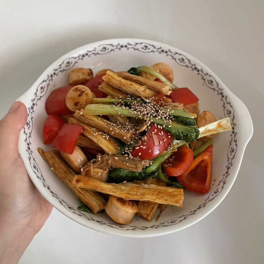 Este es un plato salteado con piel de tofu, inspirado en el Mala Xiang Guo pero con un perfil de sabor adaptado al gusto coreano. Personalmente disfruto de la piel de tofu, pero a veces la intensa sensación adormecedora del Mala Xiang Guo no me sienta bien. ¡Esta receta ofrece un toque coreano! Aunque carece del característico cosquilleo ‘mala’, no es grasoso, es deliciosamente picante y constituye un excelente acompañamiento para las bebidas.