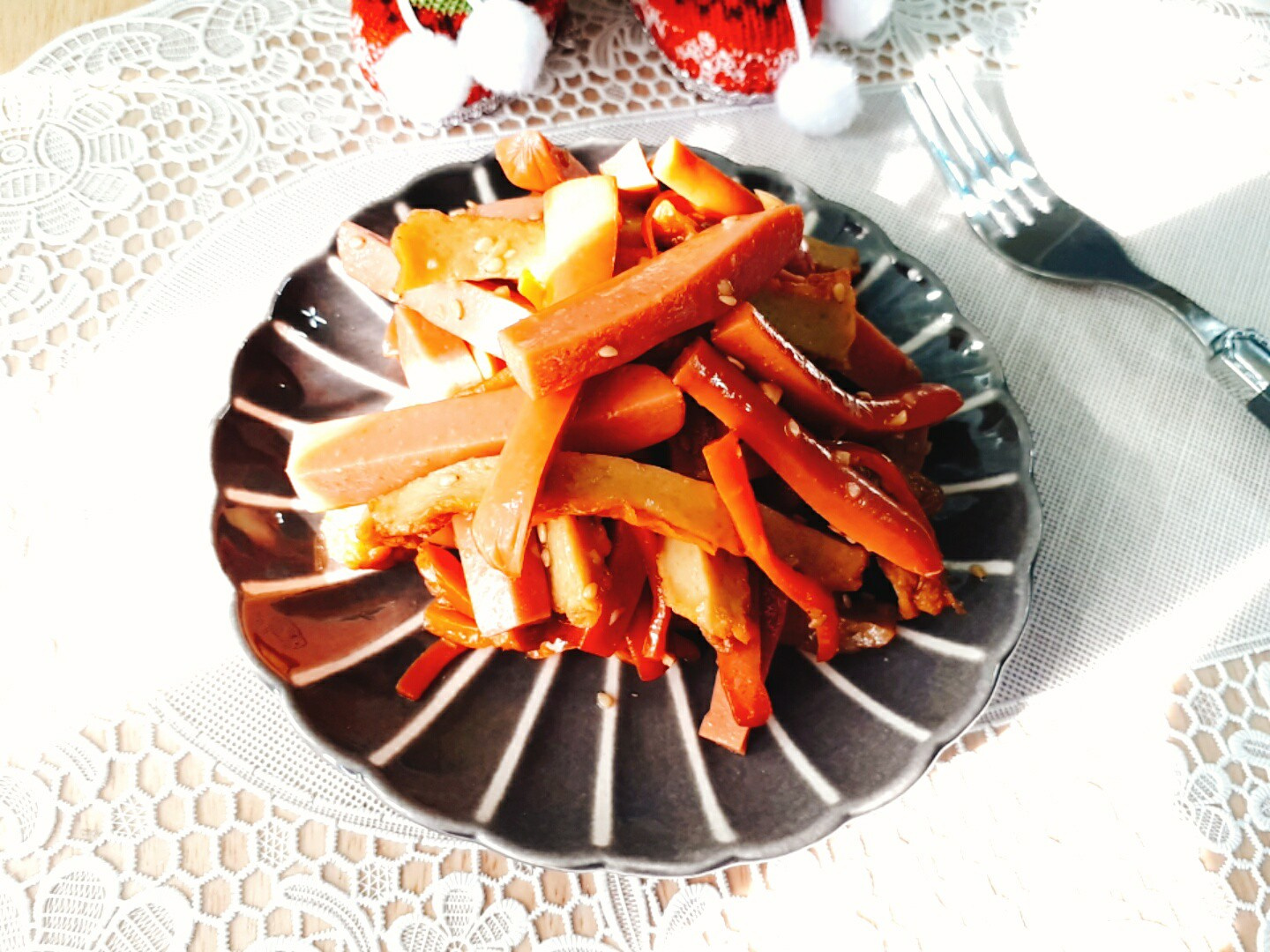 Ahora, agrega los pasteles de pescado y las salchichas a la sartén y mézclalos bien. Vierte 2.5 cucharadas de salsa de soja para estofar y 2 cucharadas de oligosacárido. Saltea rápidamente a fuego alto durante unos 3 minutos. Esto permite que la salsa cubra uniformemente los ingredientes y les da un acabado brillante.