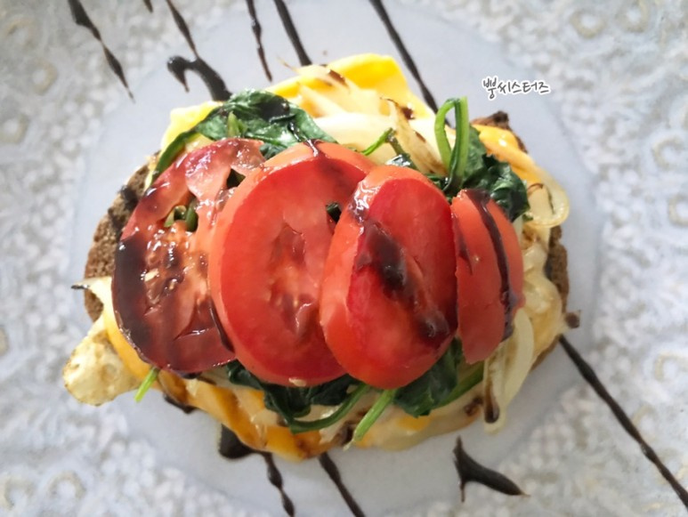 Finalmente, coloca las rodajas de tomate cortadas finamente sobre las espinacas, disponiéndolas de forma estética. La frescura y el jugo del tomate contribuyen a una experiencia de sándwich más rica.