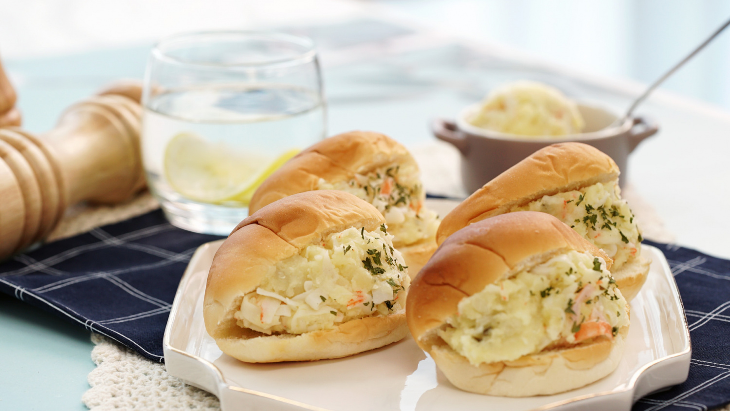 Puré de papa esponjoso se une a tierno palito de cangrejo. ¡Rellena tus panecillos de mañana para una comida satisfactoria: Receta de Sándwich de Papa con Palitos de Cangrejo!