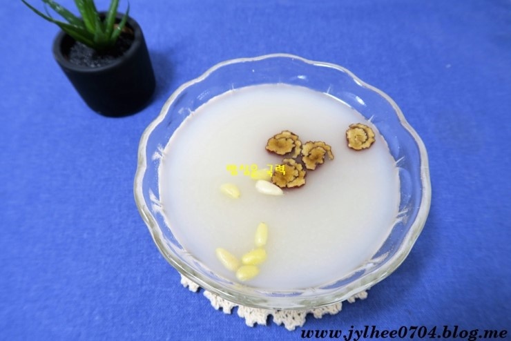 Finalmente, para una hermosa presentación, decore su Sikhye con dátiles chinos (jujubas) en rodajas y piñones. ¡Disfrute de su Sikhye casero!