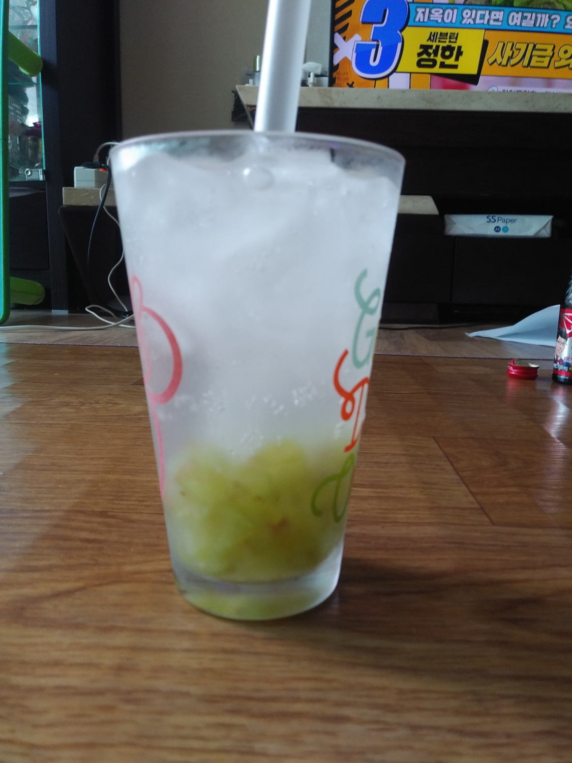 Añade el sirope de uva verde a tu taza, luego rellénala generosamente con cubitos de hielo frescos y agua con gas o gaseosa fría. Remueve bien, ¡y tu refrescante limonada de uva verde estará lista para disfrutar!