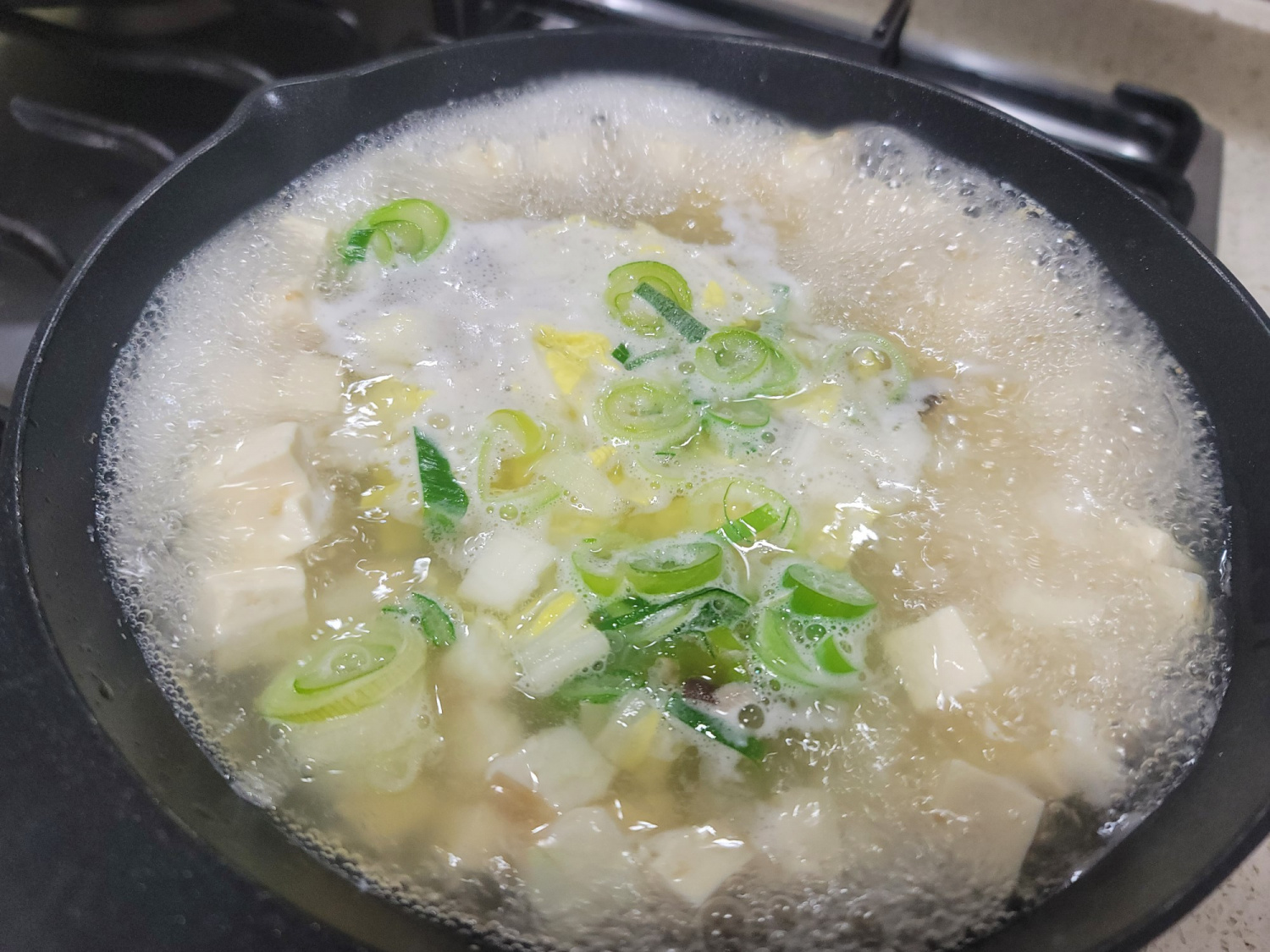 Calienta 1 cucharada de aceite de sésamo en una olla o wok a fuego medio. Añade el rábano en rodajas y sofríe durante unos 3 minutos, hasta que empiece a transparentar ligeramente. Vierte 550 ml de agua y lleva a ebullición. Una vez que hierva, añade el filete de bacalao, los champiñones preparados y la col. (Si estás condimentando para un bebé, disuelve 1/2 cucharada de pasta de miso en el caldo en este punto. Para adultos, puedes añadir salsa de soja coreana para sopa, salsa de anchoas o salsa de soja normal para sazonar. Remueve suavemente para combinar todos los ingredientes.)