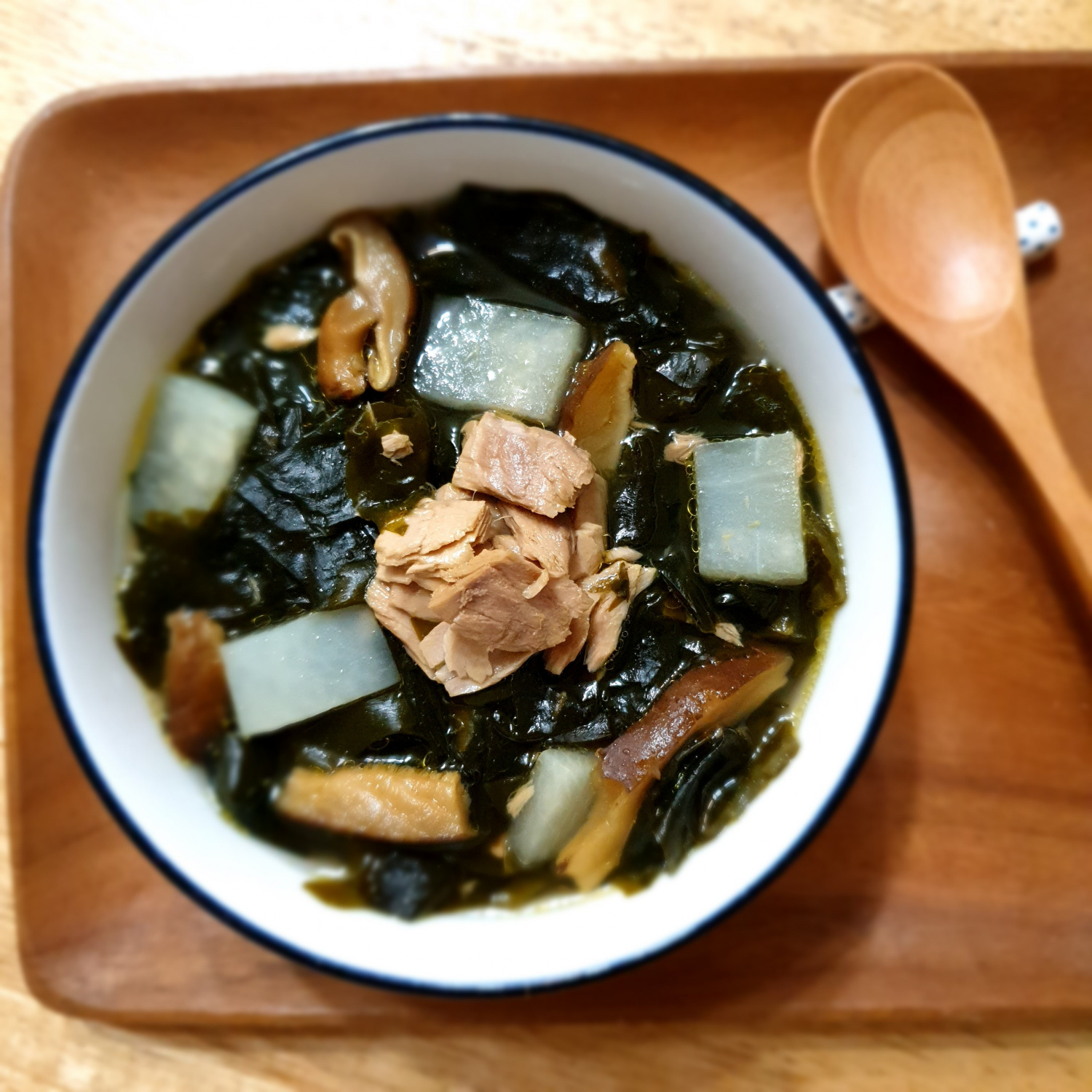 A toda mi familia le encanta la sopa de algas marinas, y a menudo la preparamos con ternera o abadejo seco. Hoy, les comparto mi receta de Sopa de Algas Marinas con Atún. Sorprendentemente, es rica y sabrosa incluso sin carne, lo que la convierte en una comida perfecta y rápida para los días ajetreados. ¡Está absolutamente deliciosa cuando se sirve con arroz! ^^