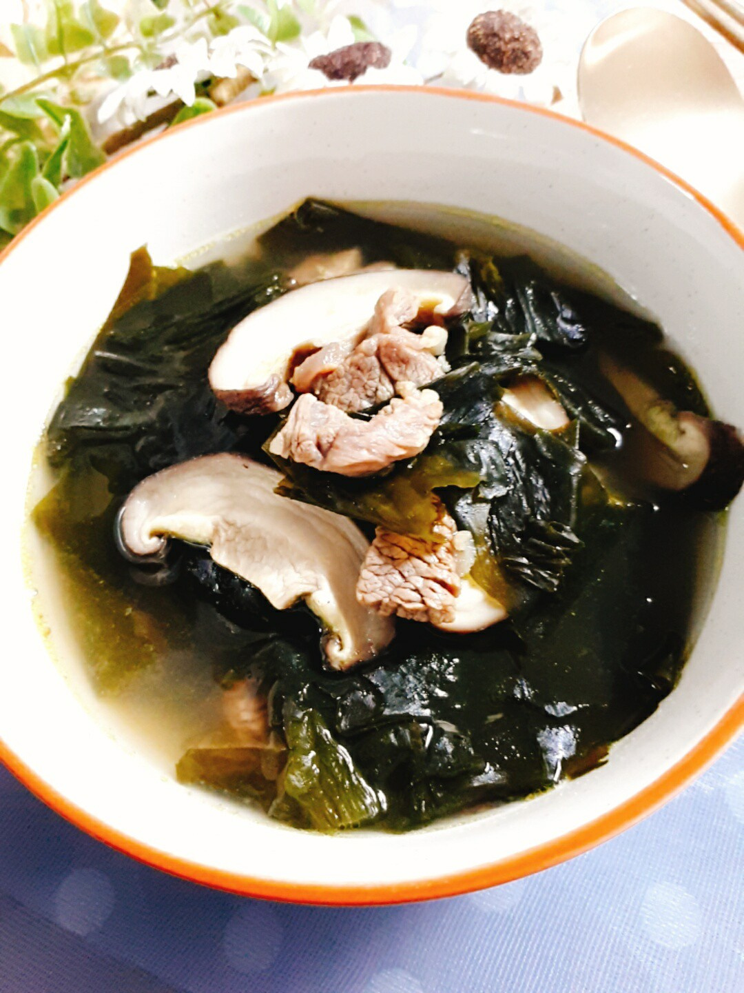Esta reconfortante sopa de algas marinas fue preparada para mi pareja, que no concibe una comida sin sopa. Está repleta del sabor profundo de la carne de res y la textura masticable de las setas shiitake.