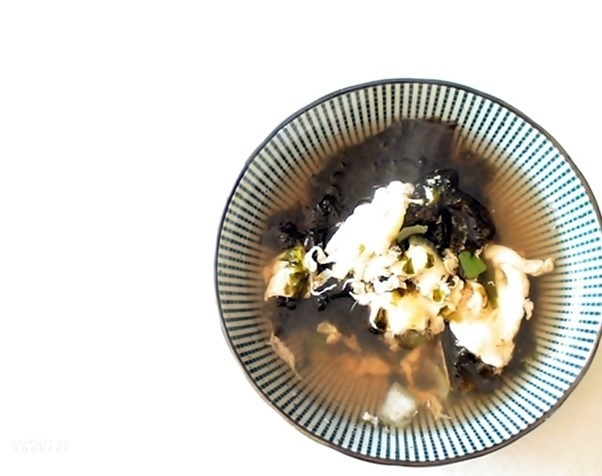 Vuelva a llevar a ebullición el caldo colado. Una vez que hierva, agregue las algas preparadas y 1/2 cucharada de salsa de soja. Deje que las algas se ablanden e infusionen el caldo con su sabor umami cocinando a fuego medio durante unos 3-5 minutos. Tenga cuidado de no cocinar demasiado las algas hasta que queden muy blandas.