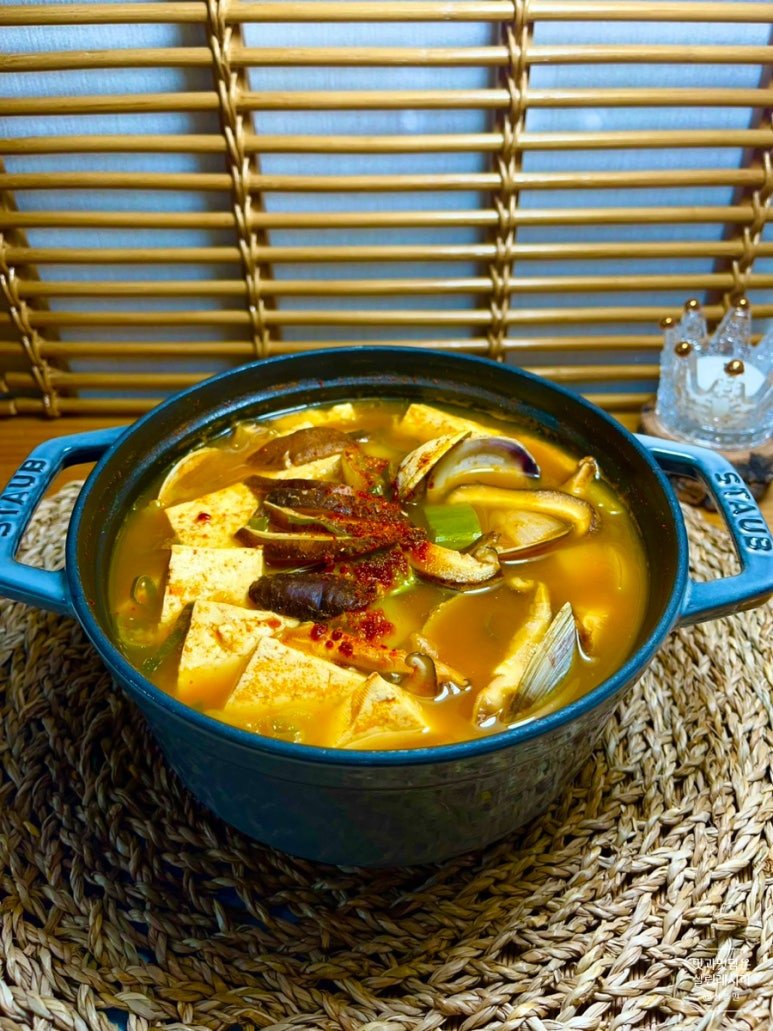 Finalmente, añade las almejas precocidas y cocina a fuego lento un momento más para terminar. ¡Este doenjang jjigae de almejas tiene un sabor más limpio y refrescante que los hechos con caldo de anchoas, lo que lo convierte en mi favorito personal! Añadir abundantes y variadas verduras al doenjang jjigae no solo es delicioso sino también una excelente manera de consumir nutrientes. Especialmente cuando se cocina con caldo de almejas, produce un profundo sabor umami sin necesidad de condimentos adicionales, lo que lo convierte en una opción más saludable y sabrosa. ¡Disfruta de un abundante y refrescante doenjang jjigae de almejas con muchos ingredientes!
