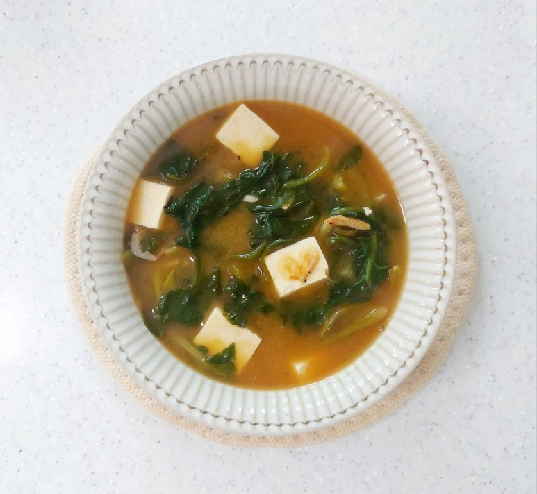 Sopa de Miso con Espinacas y Tofu con Camarones Secos