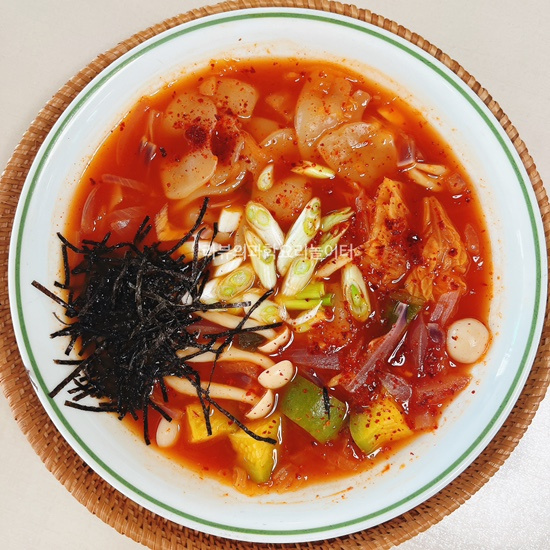 Finalmente, decora con chile coreano picado, cebolleta en rodajas diagonales y algas secas desmenuzadas. Añade más chiles si prefieres que esté más picante. ¡Sirve caliente y disfruta!