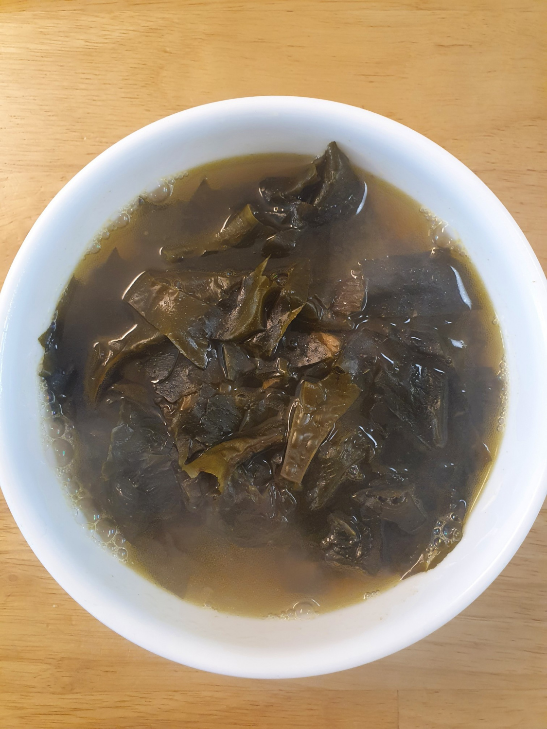 Pica las algas marinas rehidratadas en trozos del tamaño de un bocado (aproximadamente 2-3 cm). En un bol aparte, mezcla las algas picadas con 2 cucharadas de salsa de soja regular y un poco de ajo picado (aproximadamente 1/2 cucharada) para sazonarlas ligeramente. Sazonar las algas de antemano añade profundidad al sabor general de la sopa.