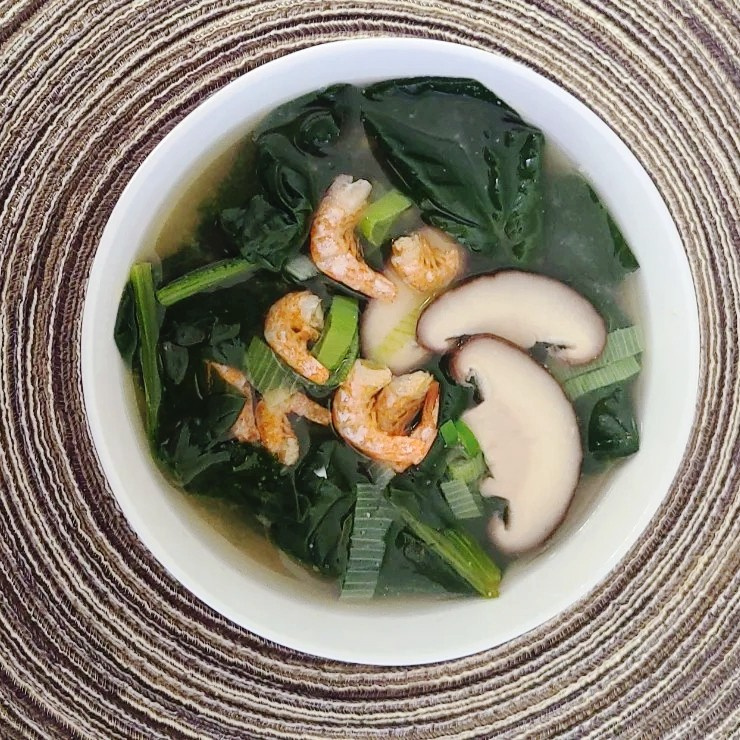 Sopa Reconfortante de Espinacas con Pasta de Soja, Camarones Secos y Shiitake