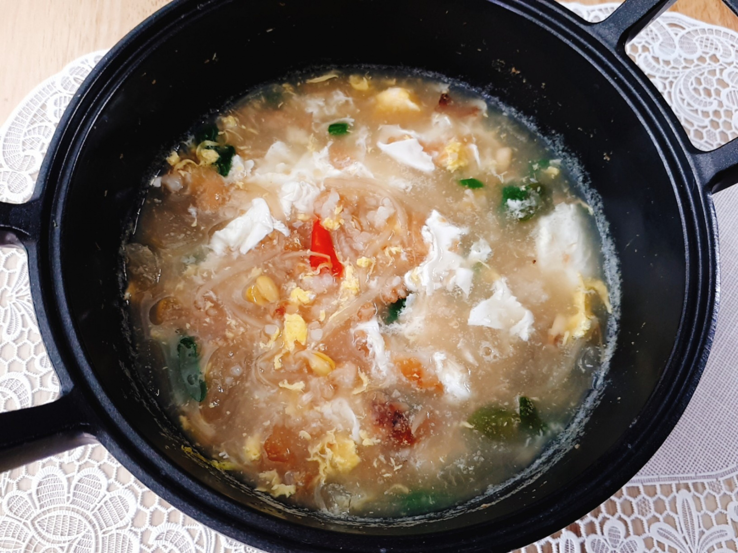 Coloca la olla al fuego y deja que hierva vigorosamente durante 7-8 minutos. El nurungji se ablandará y se mezclará maravillosamente con el caldo. Como toque final, rompe un huevo en la olla y remuévelo suavemente para terminar tu deliciosa ‘Sopa de Nurungji, Bacalao Seco y Brotes de Soja’!